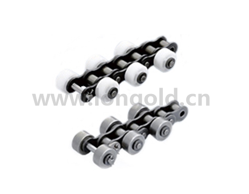 將A系列小型輸送鏈的銷軸延長,在銷軸延長部分安裝可自由旋轉的滾子。鏈條本體為鋼制,側置滾子可根據(jù)需要做成鋼制或者塑料滾子。