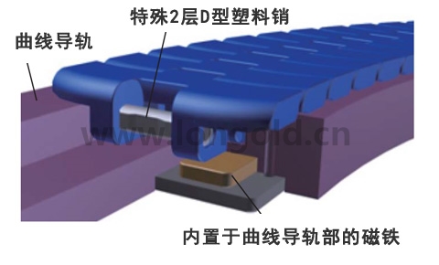 與磁鐵導軌組合使用,可有效防止曲線部的鏈條浮起。采用世界首個融合塑料和金屬銷的 「特殊2層D型塑料銷」。保持塑料特性,并可利用磁力防止鏈條上浮。「特殊2層D型塑料銷」與鏈條的滑動部分采用特殊工程塑料,因其在水濕環境的特性可以抑制磨損延伸,延長鏈條使用壽命。與全金屬材質銷相比,重量減低15%。
